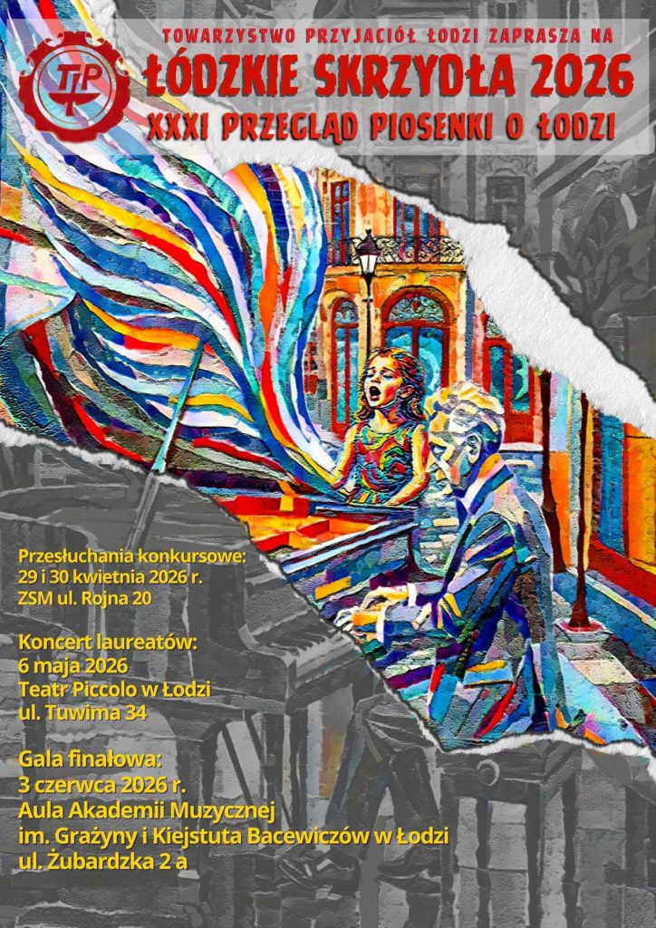 Towarzystwo Przyjaciół Łodzi, Akademia Muzyczna im. Grażyny i Kiejstuta Bacewiczów w Łodzi, Teatr Piccolo w Łodzi, Zespół Szkół Muzycznych im. Stanisława Moniuszki w Łodzi, Szkoła Podstawowa nr 175 im. H. Ryla w Łodzi oraz Szkoła Muzyczna I st. Tow. Oświatowego „Edukacja” w Łodzi ogłaszają XXXI Przegląd Piosenki o Łodzi „Łódzkie Skrzydła 2026”.