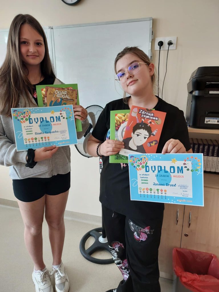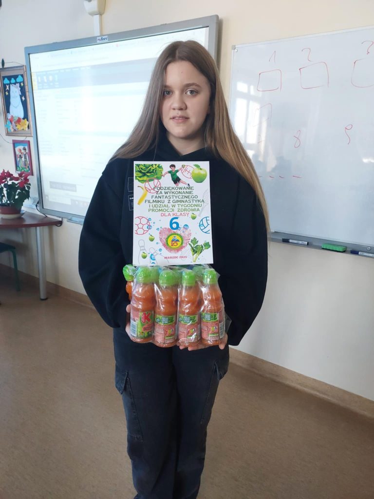 Tydzień Promocji Zdrowia zakończył się nagrodami oraz zwycięzcami. W gimnastyce śródlekcyjnej nie było zwycięzcy, ale wszyscy uczestnicy wraz z wychowawcami otrzymali zdrowe soki i musy owocowe. W konkursie na piramidę zdrowego żywienia I miejsce zdobyła Julia N. z klasy VI, II miejsce Asia D. z klasy Va, a III Bianka R. z tej samej klasy.
