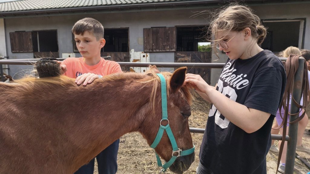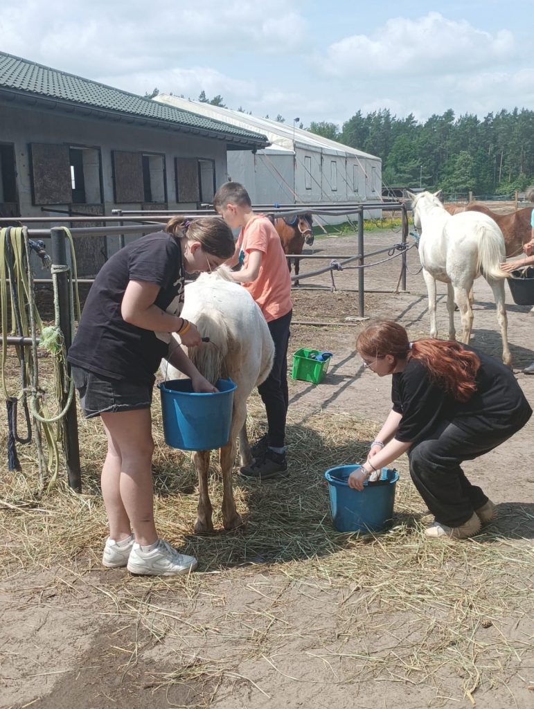 Dzisiejszy dzień był fantastyczny. Klasy Va, Vb i VIa spędziły go w stajni Zielony konik w Borowej. Trasa była długa, a więc pytanie „daleko jeszcze”? pojawiało się wiele razy. Odpowiedzi szukali w trzymanych w dłoniach telefonach komórkowych. I tak trzeba było jednak przejść około 25000 kroków. Okazało się, że niektórzy pierwszy raz widzieli kurę i koguta, pierwszy raz jechali pociągiem, pierwszy raz jeździli w siodle. Część osób w tym Filip, Maciej, Oliwia, Marysia Sofiia stali się mistrzami w czyszczeniu koni i myciu ogona. Inni świetnie wyprowadzali konie na pastwisko. Nauczyli się terminologii związanej z hodowlą koni, nazw umaszczenia, sposobów karmienia, dbania o higienę zwierząt i poznali ich właściwości terapeutyczne.