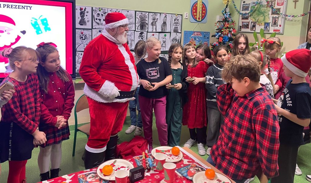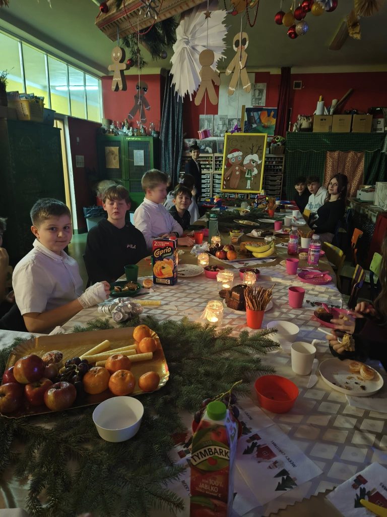 Wigilie klasowe 18 grudnia 2025 Po jasełkach uczniowie spotykali się na wigiliach klasowych, aby wspólnie kolędować, smakować świąteczne specjały i cieszyć się prezentami od Świętego Mikołaja.
