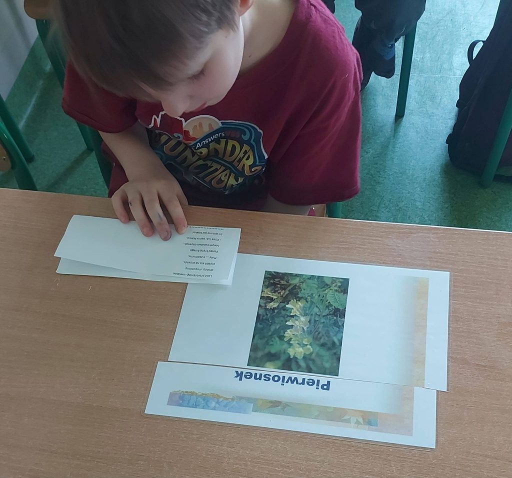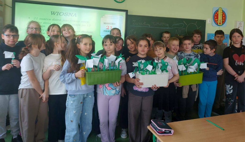 Z uwagą słuchali głośnego czytania opowiadań pt.”O żółtym tulipanie” M. Różyckiej, „Żółty zwiastun wiosny – bajka o żonkilu”, „Wiosenny krokus” G. Tompolskiego. Po wykonaniu kwiatów techniką origami – pierwszaki składały tulipany, drugoklasiści żonkile, a trzecioklasiści przebiśniegi. Dzieci uczestniczyły w zabawie muzyczno-ruchowej „Cebulka” przy fragmencie utworu A. Vivaldiego „Cztery pory roku – Wiosna”. Maluchy rozwiązywały zagadki, uzupełniały karty pracy i kolorowały ilustracje. Natomiast starszaki głośno czytały wiersze o żonkilach i przebiśniegach. Na zakończenie zajęć uczniowie umieścili te małe cudeńka w skrzynkach, które są dekoracją szkolnego korytarza. Brawo!