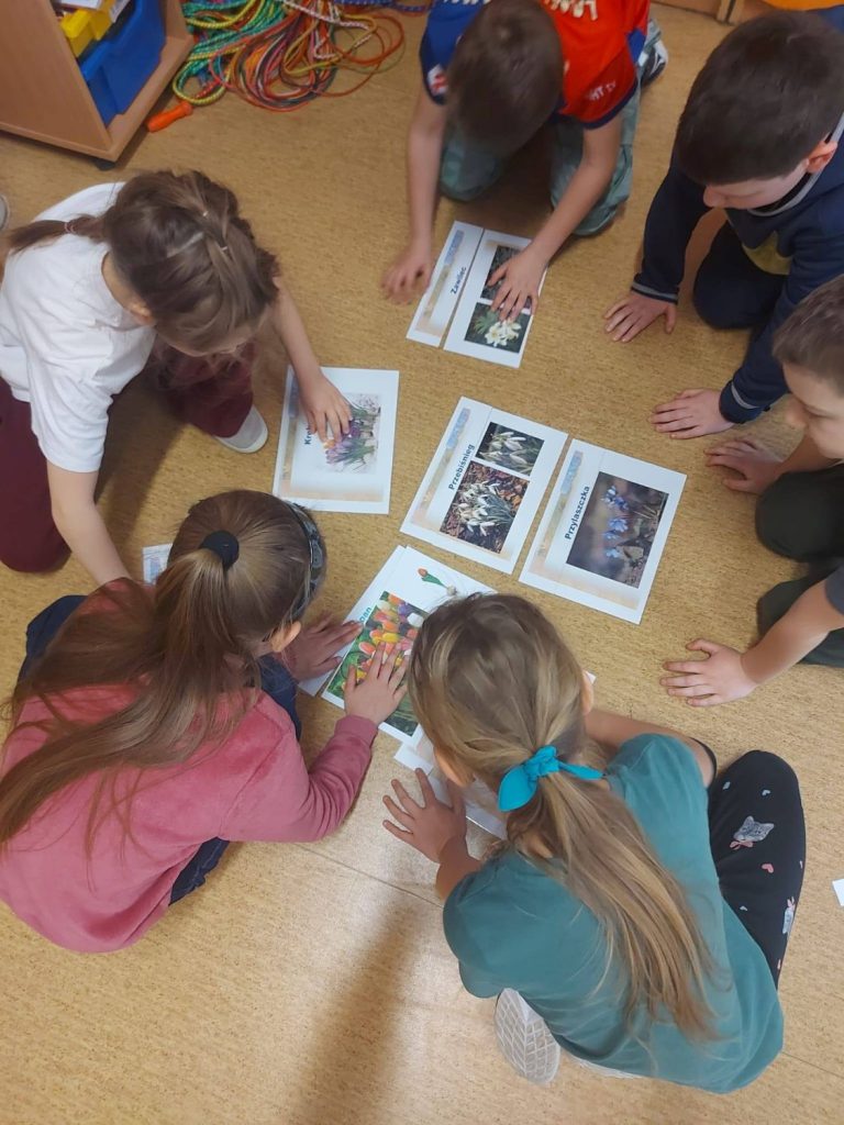 Uczniowie klas I – III po obejrzeniu prezentacji multimedialnej „Wiosenne kwiaty” i wysłuchaniu bajki wypowiadali się, jakie zaobserwowali zwiastuny wiosny, co nowego zauważyli w przyrodzie, wymieniali nazwy pierwszych wiosennych kwiatów ogrodowych i chronionych.